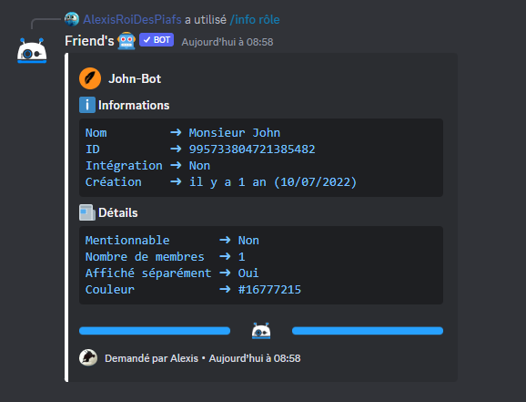 Informes toi avec des commandes simples d'utilisation telles que "/info serveur" ou encore "/info salon" et bien d'autres ! Découvres le bot en détail grâce à des commandes informatives telles que "/info devenir" ou encore "/info système" !